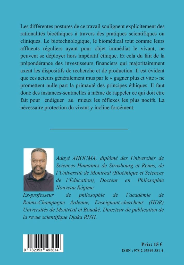 La quête lucrative sans digue, véritable phare de ces instances, mérite contrôle vigilant et outillé. Voilà donc l’aire d’action de la bioéthique. Les nécessaires recherches pour atténuer ou infirmer les pathologies qui affectent l’humanité ne doivent pas nous transformer en objet à disposition de n’importe quelle manipulation. L’éthique doit mettre de l’ordre là où il y a nécessité. Notre analyse explicite toutes ces réalités en pointant clairement ce qui est requis à travers des légalités structurantes. A travers principes éthiques, lois, règles et déontologies, nous montrons que le non- respect des indications peut réellement affecter sujets de recherche et patients. Cette investigation qui prolonge les réflexions de notre précédent ouvrage (Balises bioéthiques, 2023) est une quasi apologie des bienfaits de l’éthique.