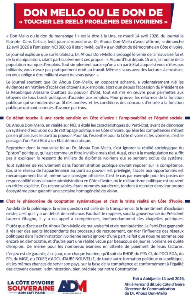 Si Don Mello ment, la publication par vos soins, au journal “Le Patriote”, des décrets, des PV de Conseils d’Administration, des CV et des organigrammes suffira à le confondre. Si vous refusez la transparence et préférez l’injure, c’est que le service de communication du ministre Ahoua Don Mello a raison : il a touché le réel. La vérité ne craint pas la lumière. Le mensonge la fuit.